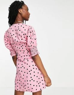 Wednesday’s Girl Mini Wrap Dress With Shirred Sleeves In Polka Dot For Women Pink Black Polka Dot