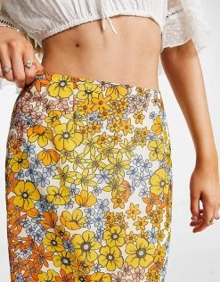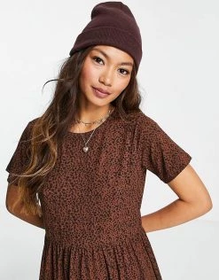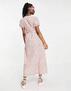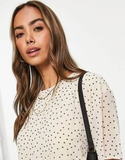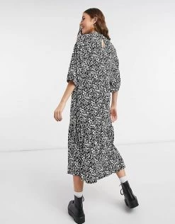 Wednesday’s Girl Midi Smock Dress With Full Skirt In Ditsy Spot Print For Women Cream Black Spot