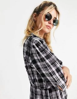 Wednesday’s Girl Midi Smock Dress With Peplum Hem And Shirring In Check For Women Lilac Black Check