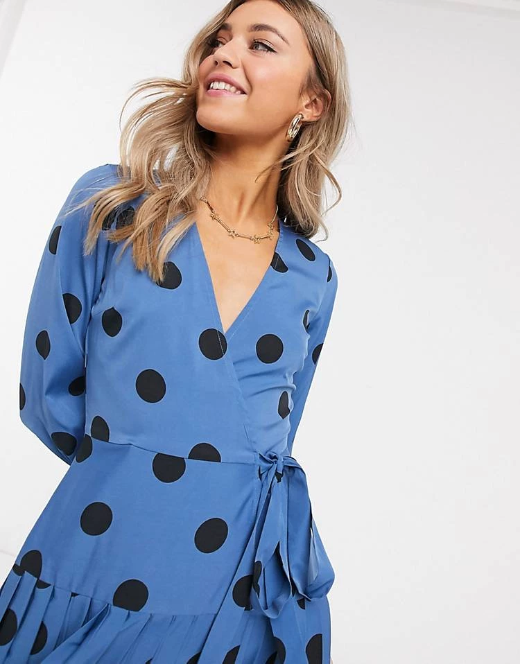 This dress is perfect for a summer day out. The wrap style is very flattering and the pleated skirt adds a nice touch. The blue and black spot pattern is unique and eye-catching.